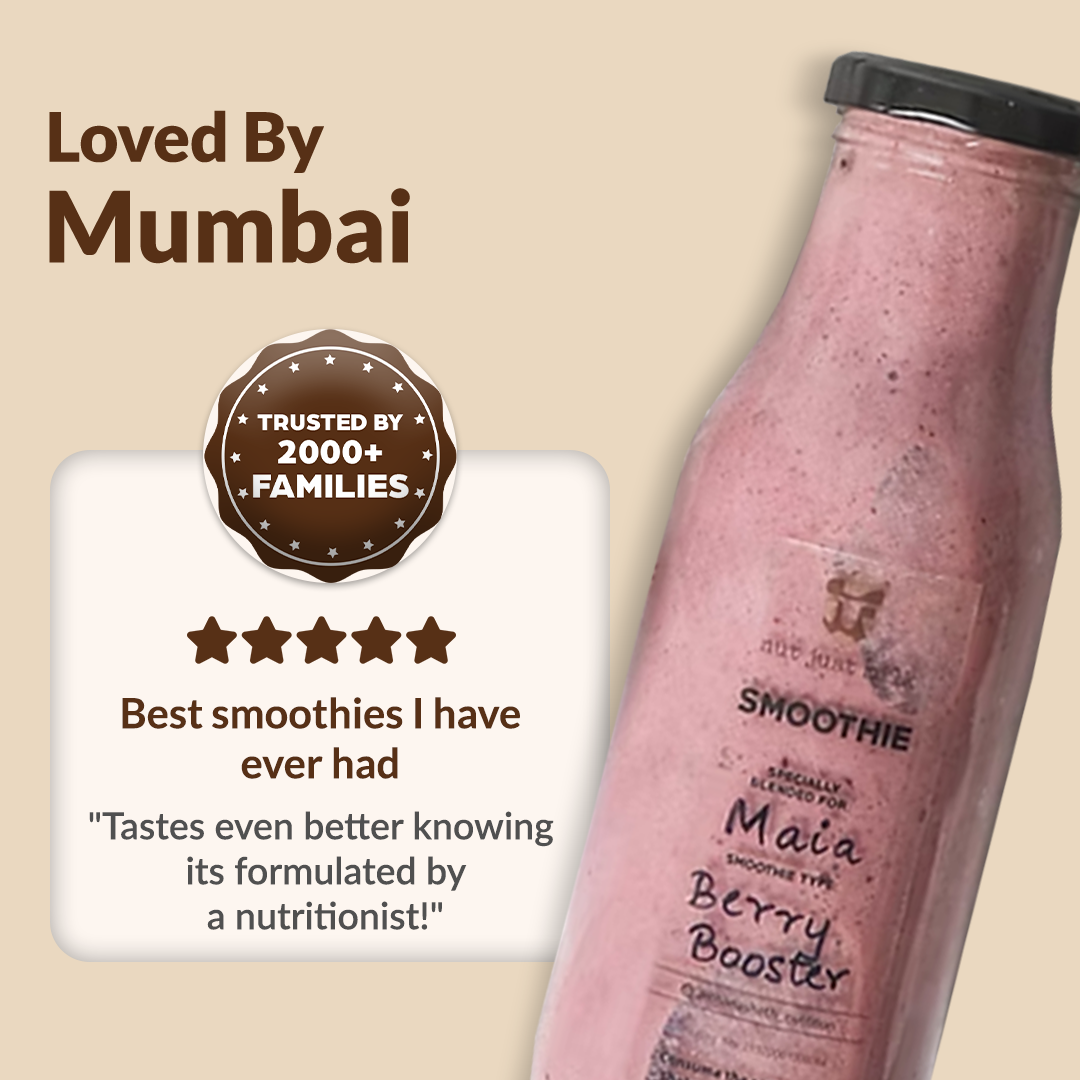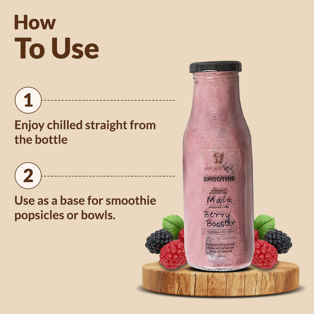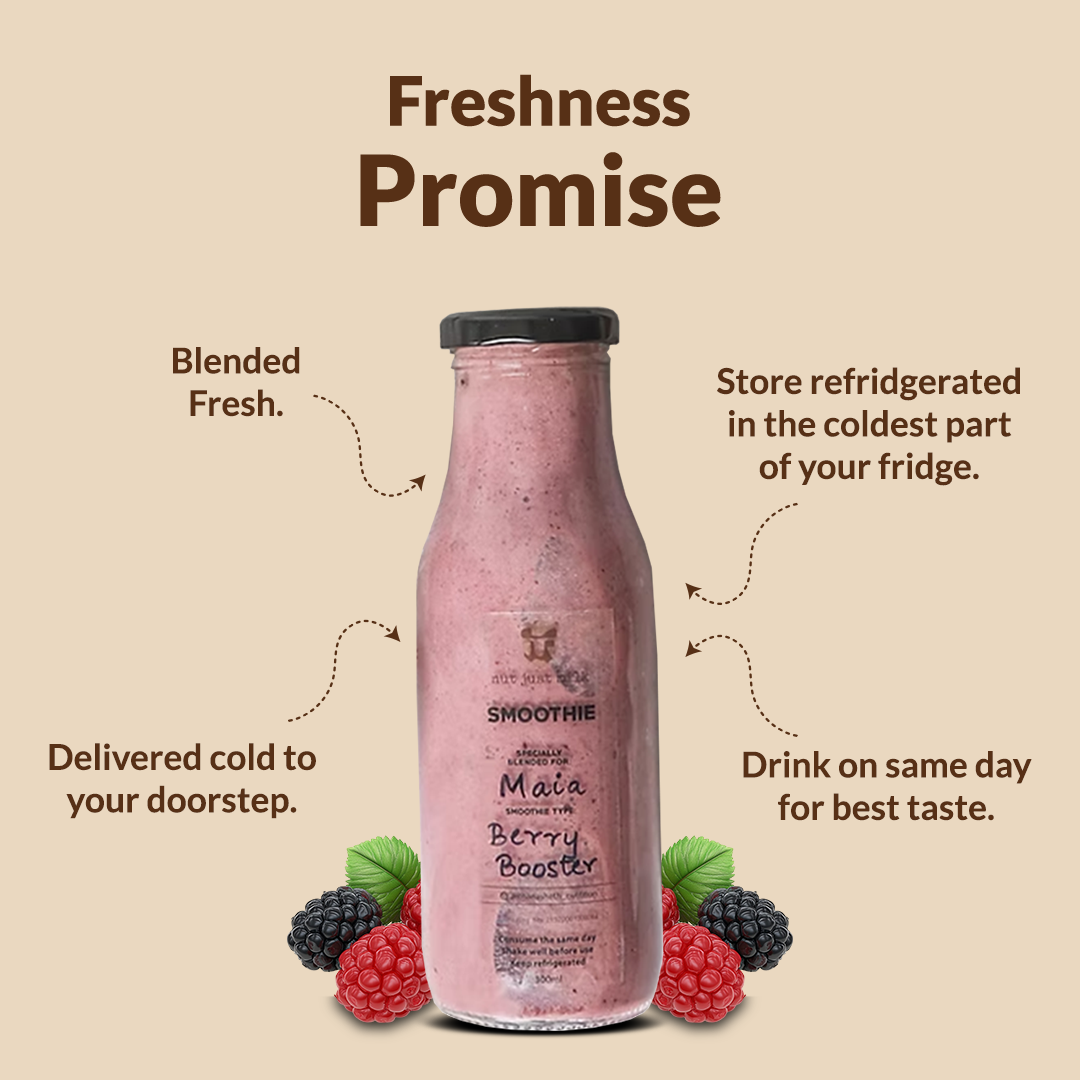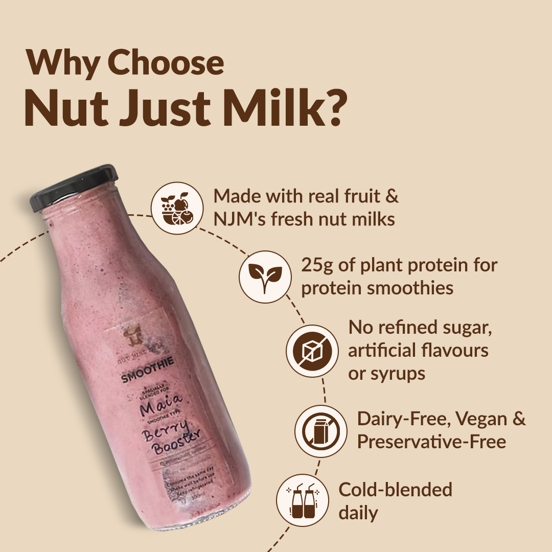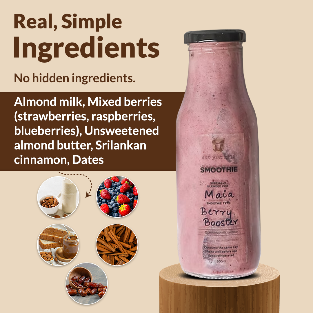 Ingredients: NJM Almond Milk, Mixed Berries (Strawberries, Raspberries, Blueberries), Pitted Dates, Unsweetened Almond Butter, Cinnamon.