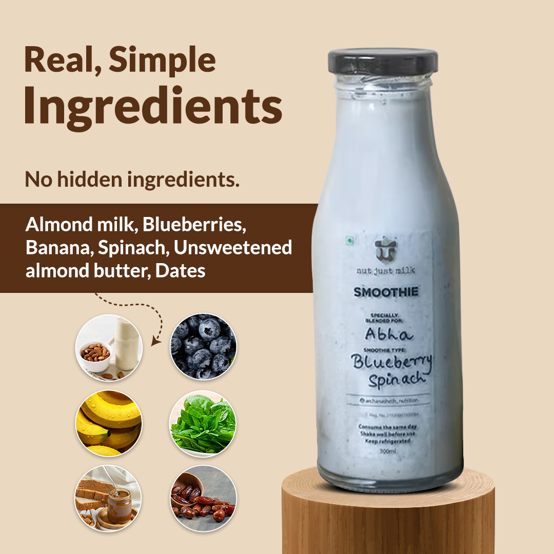 Ingredients: Almond Milk, Blueberries, Banana, Spinach, Pitted Dates, Unsweetened Almond Butter